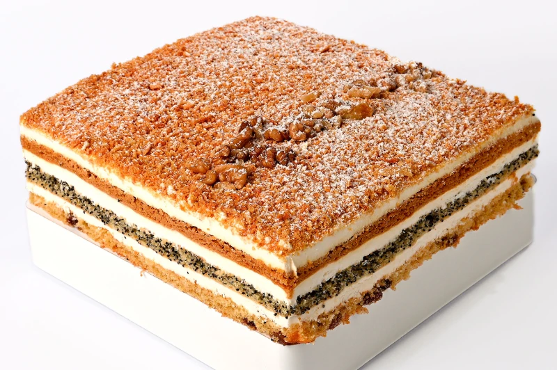 масляный бисквит с маком, масляный бисквит с изюмом, медовый корж, крем на основе сметаны